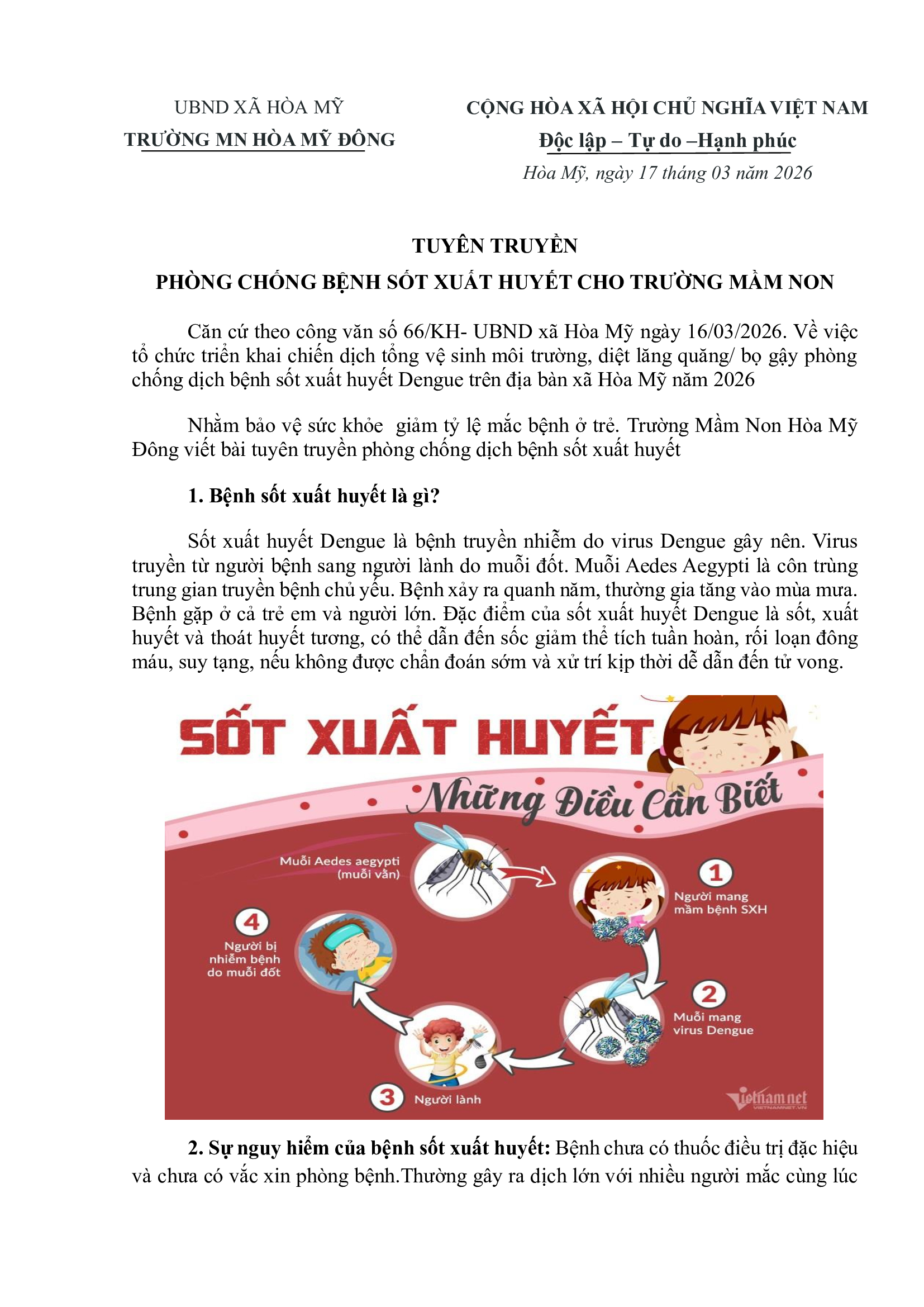 Hiện nay, bệnh Sốt xuất huyết Dengue đang có xu hướng gia tăng, đặc biệt trong thời điểm thời tiết nắng nóng, mưa nhiều – điều kiện thuận lợi để muỗi sinh sản và phát triển. Để bảo vệ sức khỏe cho trẻ và cộng đồng, Trường Mầm non Hòa Mỹ Đông xin gửi đến quý phụ huynh một số thông tin và biện pháp phòng chống dịch bệnh.